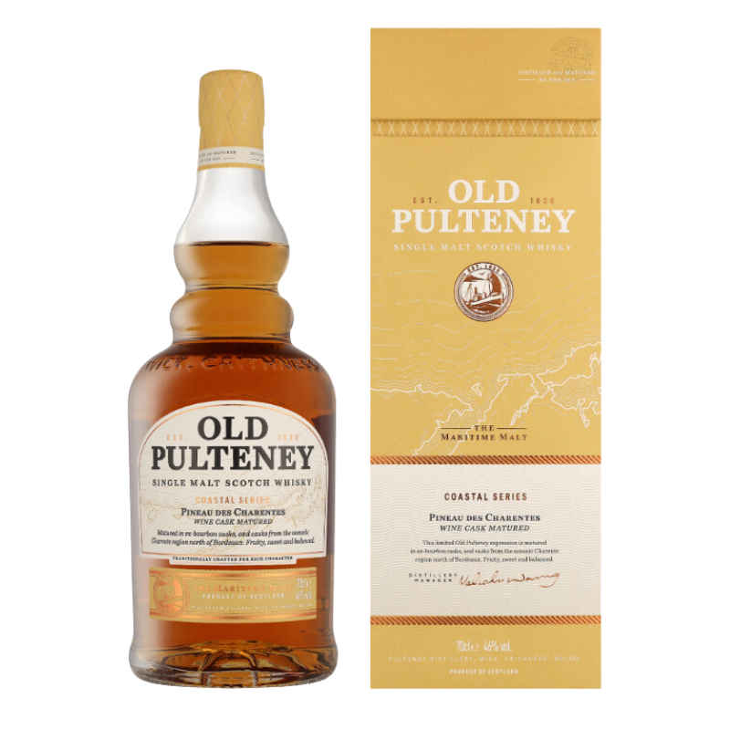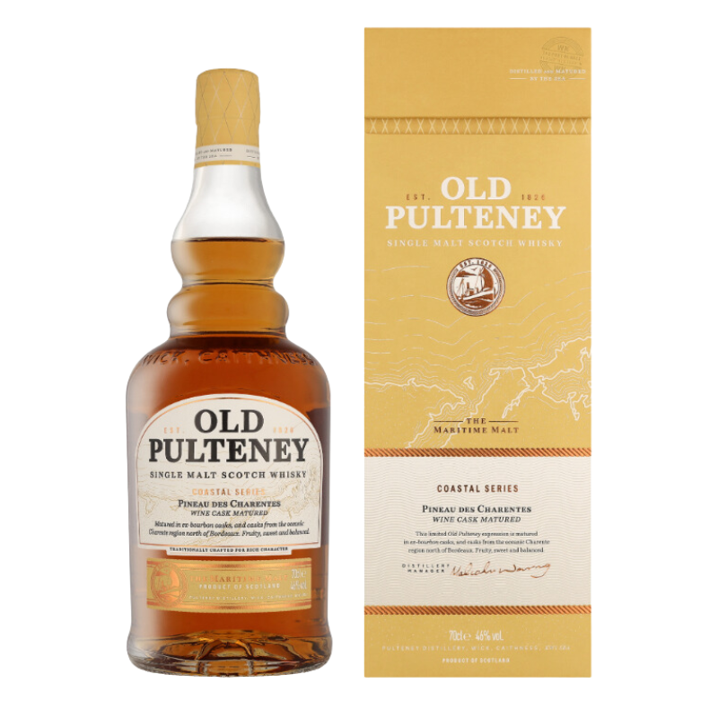 Old Pulteney, surnommé « le whisky maritime », est une distillerie écossaise fondée en 1826 à Wick, influencée par les embruns salins de la côte. Son affinage en fût de Pineau des Charentes apporte une touche de douceur et de complexité à son profil iodé. Ce partenariat France / Écosse enrichit le whisky de notes fruitées, boisées et épicées, équilibrant la touche iodée et l’aromatique du Pineau.