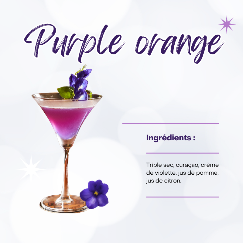 Jus de pomme, jus de citron, liqueur de violette, triple sec et curaçao.