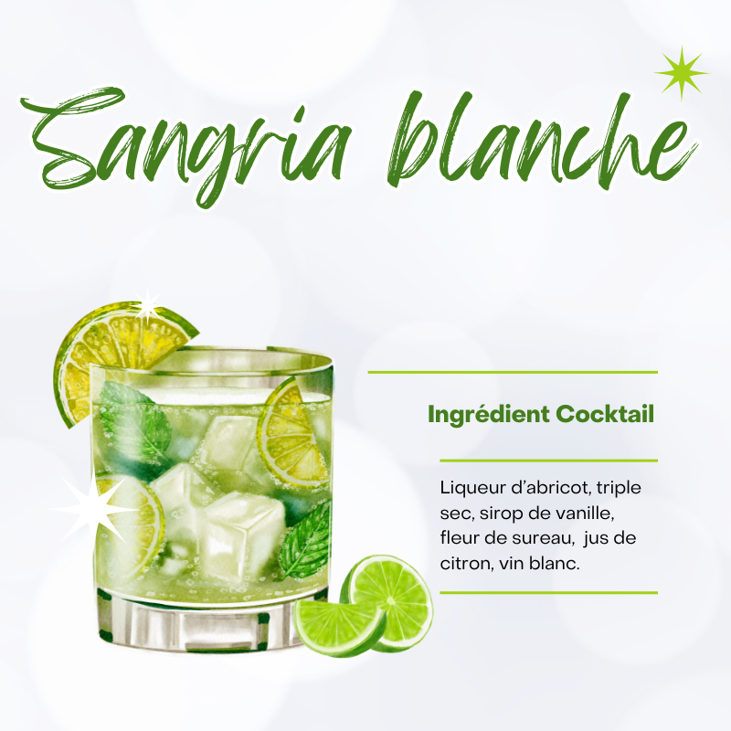 Vin blanc (vin de France), jus de citron, liqueur de triple sec, liqueur d’abricot, sirop de fleur de sureau et vanille.