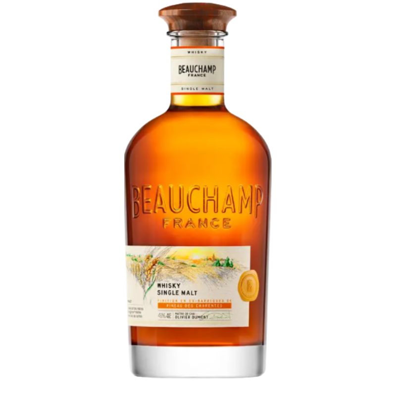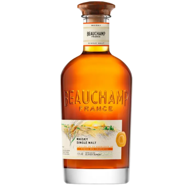 Le Whisky Beauchamp Single Malt est un whisky français distillé en Charente, dans la distillerie de Bercloux, à partir d’orge maltée locale. Après un vieillissement en fûts de chêne français, il bénéficie d’un affinage unique en ex-fûts de Pineau des Charentes, qui lui confèrent richesse aromatique et originalité. Embouteillé à 46 %, sans filtration à froid ni coloration, il incarne le savoir-faire des Bienheureux, artisans du whisky moderne en France, récompensé notamment par une médaille d’or aux World Whiskies Awards 2024.