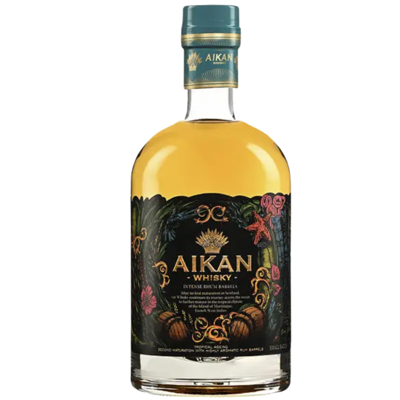 Aikan est un whisky français singulier dont le nom signifie « mariage » en japonais, symbole de la rencontre entre le savoir-faire écossais et un élevage sous climat tropical. Distillé en Écosse à partir d’orge maltée, il bénéficie d’un affinage en fûts ayant contenu du rhum avant de poursuivre son vieillissement en Martinique, où la chaleur intensifie les échanges avec le bois et enrichit sa palette aromatique. Il offre un profil gourmand et accessible, marqué par des notes de vanille, de fruits exotiques, de caramel et d’épices douces, avec une bouche ronde et une finale chaleureuse.